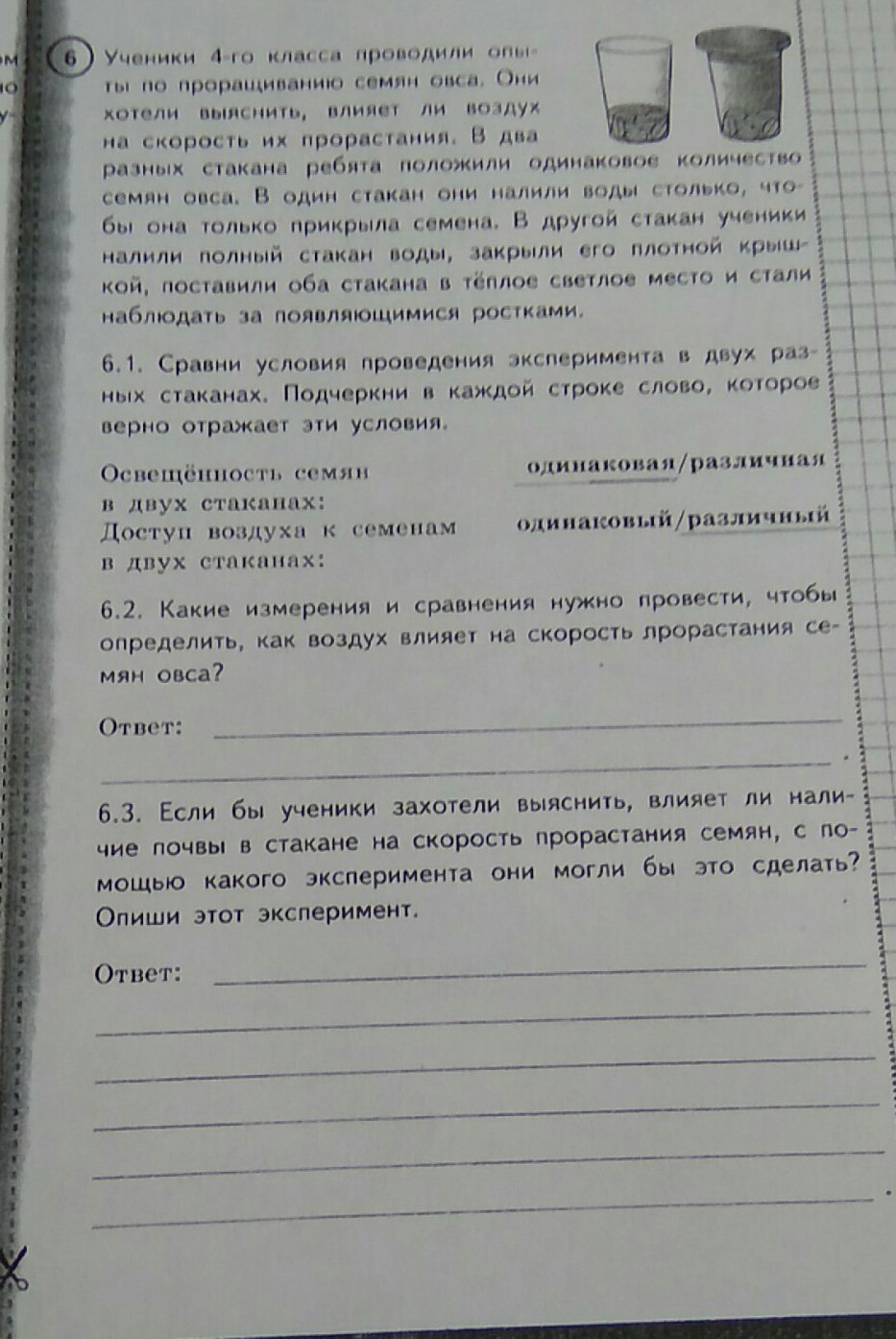 6. 3 Им необходимо было бы в один стакан с семенами налить немного воды, а в второй стакан с семенами кроме воды добавить также немного почвы.